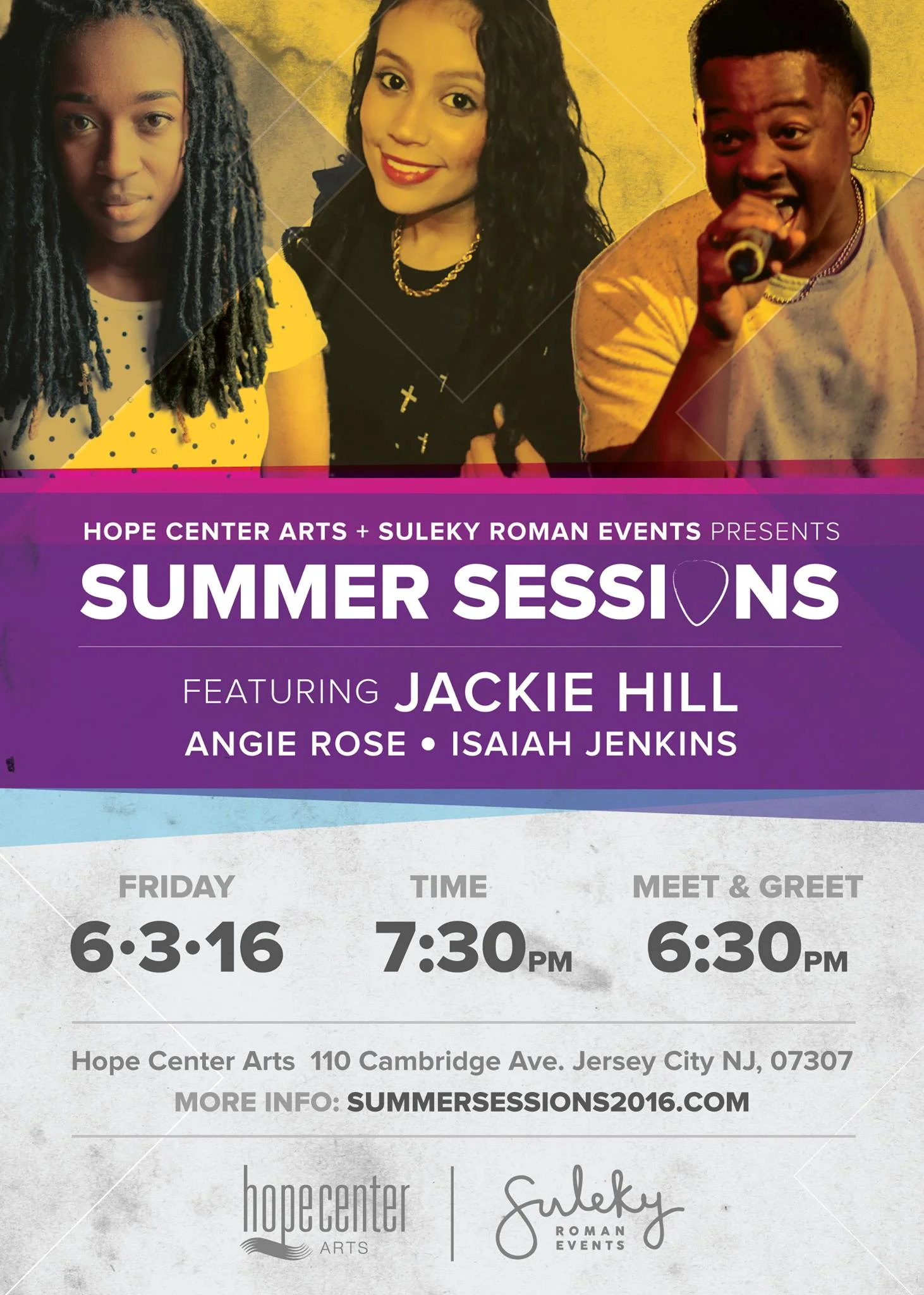 Summer Sessions 2016 at Hope Center Arts. Jackie Hill Perry, Angie Rose and Isaiah Jenkins. Jackie Hill Perry our featured artist, is an American poet, writer, and hip hop artist from St. Louis. Hill-Perry initially garnered popularity for her performances of spoken word pieces such as "My Life as a Stud", "A Poem About Weed", and "Jig-a-Boo" at the Passion 4 Christ Movement (P4CM) and her newest "American Persecution" She is an artist on Humble Beast label.